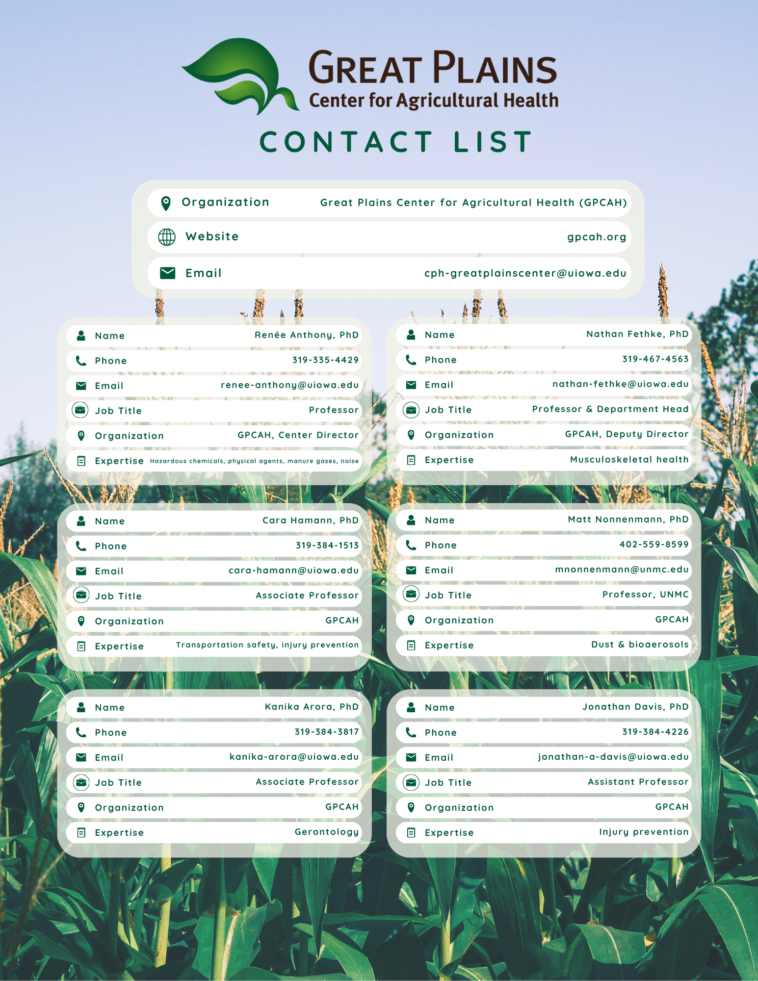 Rich Gassman, Director of ICASH, and Renee Anthony, Director of the GPCAH, want to thank you for visiting this page and learning important information to help share stories about hazards and injury prevention on the farm.